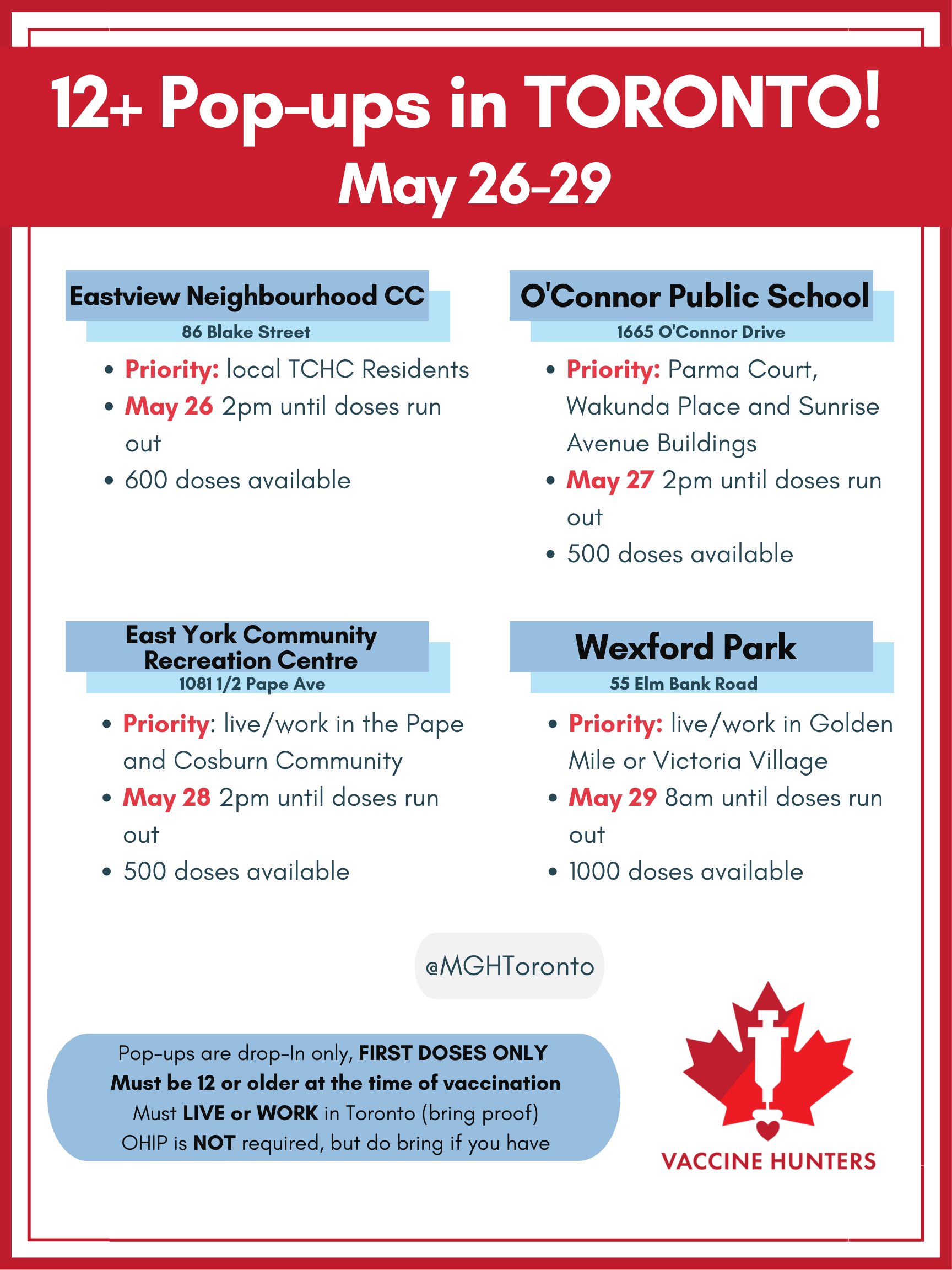 Vaccine Hunters Canada On Twitter On Toronto Mghtoronto Is Hosting 4 12 Pop Up Clinics This Week May 26 29 Must Live Or Work In Toronto Must Be 12 Years Or Older At The